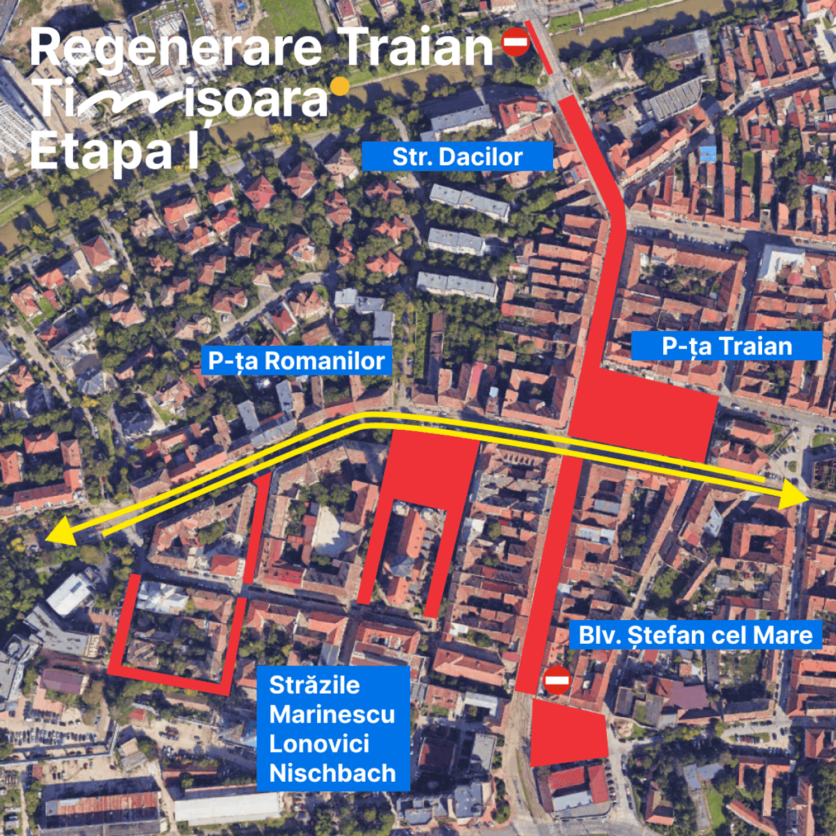 Pentru demararea lucrărilor din Piața Traian, accesul auto și pietonal pe suprafața pieței va fi restricționat, inclusiv pe lateralele dinspre Biserica Ortodoxă Sârbă și Palatul Mercur.
